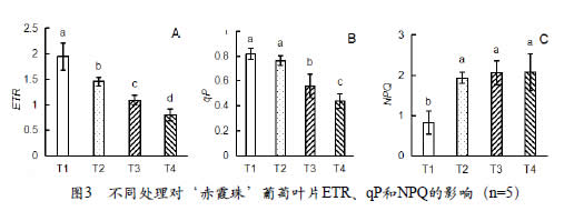 T 4 : 盆栽‘ 赤霞珠’ 葡萄经臭氧(110nL· L- 1) 和强光(1600μmol·m-2·s-1)协同处理3h。处理结束后立即进行葡萄叶片气体交换参数和叶绿素荧光参数的测定。