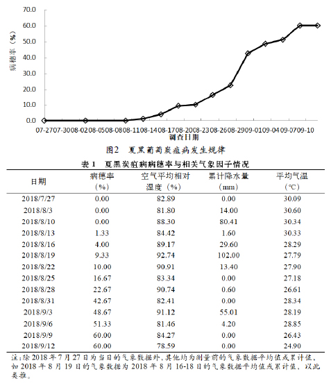 由表1可见,相对湿度高于90%、28 ℃左右的中温更有利于夏黑葡萄炭疽病的发生,其病穗率上升相对较为迅速;发病前期(8月10日前)的降水为炭疽病的发生提供了较好的发病条件,而发病期8月16日-22日、9月3日前的降水为空气湿度的上升提供了充足条件,进而促进了葡萄炭疽病的发生。