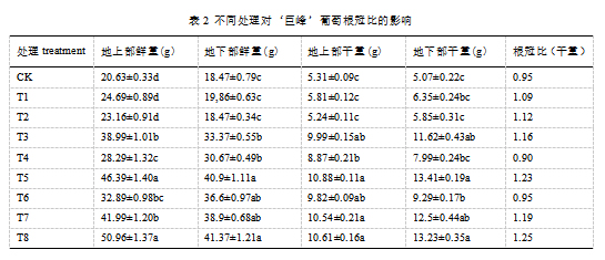 2.3 不同有机物料配施菌剂对葡萄幼苗地上部、地下部鲜重及根冠比的影响