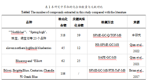 本研究通过优化HS-SPME技术,对蓝莓样品中的香气组分进行了深入分析。通过与现有文献中报道的几种前处理方法进行比较,我们发现优化后的HS-SPME技术在挥发性化合物的总数量和关键组分的数量上均有显著提升。具体而言,本研究共检测出318种挥发性风味化合物,这一数量大约是其他文献报道的化合物数量的三倍(见表1)。
