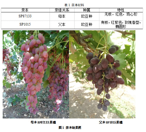 在葡萄杂交育种中亲本的选择、选配是十分重要的。亲本的选配应注意在育种目标的前提下,目标性状要优缺点互补。此次我们选用了自育优系SP87133作为母本,是一个大粒无核红色葡萄优系,具有丰产、果穗大的特点,但是也有着色差、果皮薄易裂果的缺点。该杂交组合旨在选育出大粒、有香味、着色佳、抗性强的无核葡萄新品种。 我们借助胚挽救技术,父本选择优系SP1015,它是一个红色有核有玫瑰香味品种。