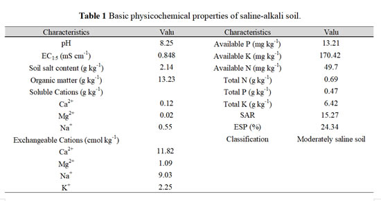 本实验供试土壤均取自黄河三角洲(滨州)国家农业科技园区(37°58′N,118°09′E)。该区域属于温带季风气候,平均海拔8.5米,年平均气温为14.1摄氏度,年平均降水量为691.6毫米,年平均日照时间为2632.0小时。土壤基本理化性质如表1所示。