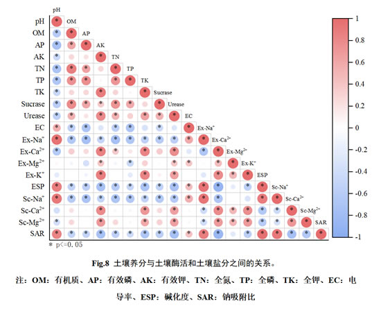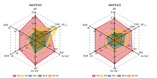 各处理下土壤的交换性Na⁺与水溶性Na⁺含量均显著下降,降幅范围分别为22.90%~35.13%和17.30%~26.81%。伴随于此,土壤pH值、交换性钠百分比(ESP)及钠吸附比(SAR)相较于对照均有所降低。进入下半年观测期,对照组土壤pH、ESP、SAR指标有部分提高,但处理组土壤基本维持在上半年的水平,而土壤电导率(EC)则进一步降低。EC值的下降通常指示土壤溶液中可溶性盐分离子总量的减少,由于伴随降雨、灌溉淋溶而降低。实验结果与之前的盆栽实验结果是相一致的。