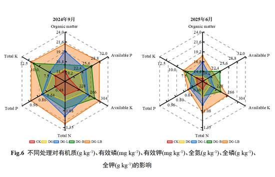 如图6所示,各处理均提高了土壤养分指标。上半年数据显示,DG-L处理使有机质和全氮含量分别提高了33.29%和42.68%,DG-B处理在全钾、有效钾、有效磷指标上与CK相比分别提高了81.74%、23.25%和46.72%,而DG-LB处理综合了DG-L和DG-B的优势,全面提高了土壤养分含量。下半年数据显示,尽管各处理的土壤养分因季节性原因(降雨淋溶)在不同程度上均有所降低,但是与CK相比仍然保持较高的水平。