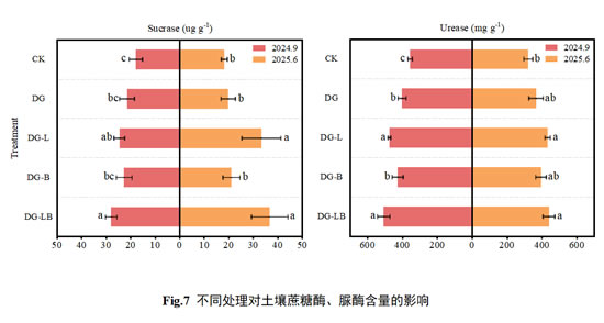 如图7所示,上半年数据显示,各处理的土壤蔗糖酶和脲酶活性较CK相比均显著提升。其中,DG-L处理的蔗糖酶活性提高37.82%,脲酶活性提高33.20%;DG-LB处理的蔗糖酶活性提升56.53%,脲酶活性提升49.28%,二者增幅最为显著。下半年数据显示,尽管各处理组的酶活性整体呈下降趋势,但DG-L与DG-LB处理的蔗糖酶活性仍高于前期,且两处理组与CK的差异始终保持显著。这一变化与同时期土壤有机质及全氮含量的波动特征一致。