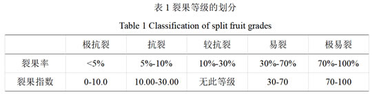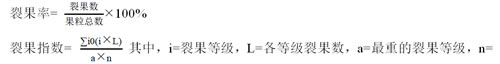 裂果等级的划分参照孙双双(2023)的方法,即0级:表面未出现裂口;1级:有1条长度不超过横、纵径1/2的裂口;2级:有1条长度超过横、纵径1/2的裂口或有2条长度不超过横、纵径1/2的裂口;3级:有2条长度超过横、纵径1/2的裂口或有3条长度不超过横、纵径1/2的裂口;4级:有3条长度超过横、纵径1/2的裂口或有4条长度不超过横、纵径1/2的裂口;5级:裂口面积超过果实表面积的1/2。