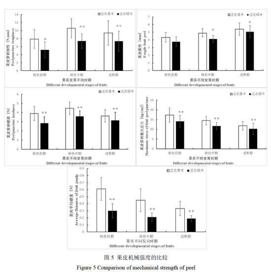 2.2 沈农香丰’与‘沈农硕丰’果皮机械强度的比较