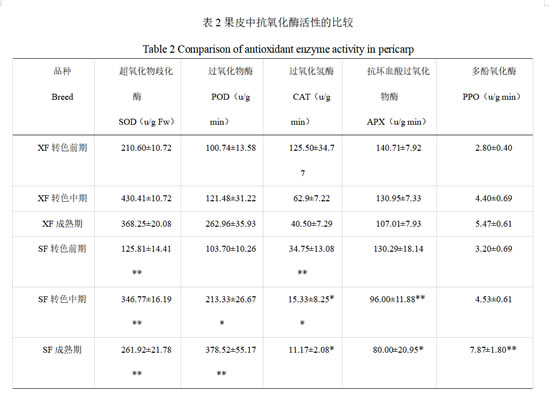 由表2可知,随着果实转色成熟,两者果皮中SOD的活性均呈先上升后下降的趋势,XF的SOD活性始终极显著高于XF。随着果实转色成熟,两者果皮中POD和PPO活性呈逐渐升高的趋势,在转色中期时,SF的POD活性显著高于XF,在成熟时,SF的POD活性和PPO活性均极显著高于XF。随着果实转色成熟,两者果皮中CAT活性和APX活性均呈逐渐下降的趋势,在转色前期时,XF果皮中CAT活性极显著高于SF,在转色中期时,XF果皮中CAT活性和APX活性均极显著高于SF,在成熟时,XF果皮中CAT活性和APX活性均显著高于SF。