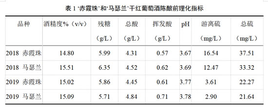 葡萄酒样品为新疆玛纳斯产区中信国安葡萄酒业有限公司于2018年和2019年采摘并酿造的‘赤霞珠’(Cabernet Sauvignon)和‘马瑟兰’(Marselan)干红葡萄酒,所有干红葡萄酒均以成熟度良好的葡萄以工业化葡萄酒的酿造方式进行酒精发酵和苹果酸-乳酸发酵。2018年和2019年‘赤霞珠’和‘马瑟兰’葡萄酒在发酵结束后采用中度烘烤的法国圣哥安橡木桶进行陈酿。根据供应商所建议的添加量,每个品种的葡萄酒均设置在陈酿前添加200 mg/L葡萄籽单宁(ST)、200 mg/L葡萄皮单宁(SKT)、200 mg/L葡萄皮籽混合单宁(MT,混合比例1:1)的3种处理组和不添加单宁的对照组,陈酿周期为12个月,分别在陈酿初始点第0个月(0M)、陈酿6个月(6M)及陈酿12个月(12M)取样进行分析。所有处理组和对照组均设置2个重复,橡木桶陈酿温度控制在14-16℃,湿度控制在65-75%。入桶前的葡萄酒基本理化指标见表1。