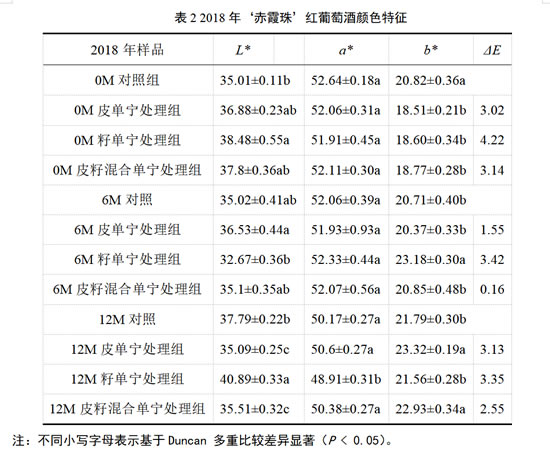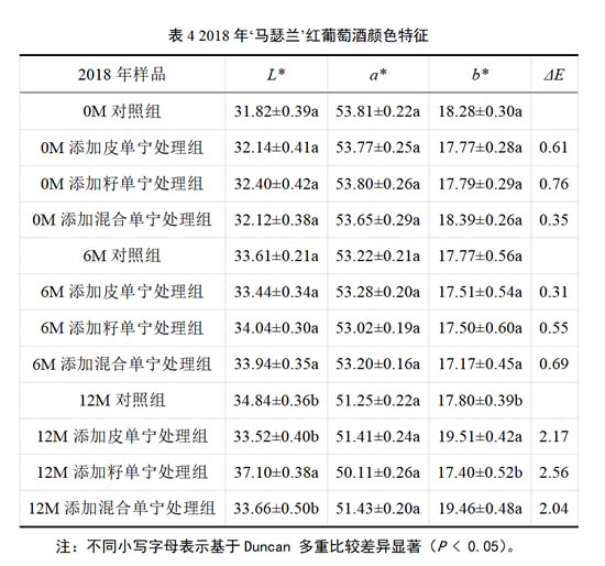 如表4所示,对于2018年的‘马瑟兰’葡萄酒,其L*、a*、b*值,在陈酿过程中,对照组及各处理组之间均不存在显著性差异。在陈酿12个月时,籽单宁处理组的酒体颜色最浅,其L*值显著高于对照组及其他处理组,且其b*值最低,这表明在添加葡萄籽单宁后,‘马瑟兰’酒样黄色色调减弱,葡萄籽单宁可能有助于延缓‘马瑟兰’干红葡萄酒的黄化。然而,综合对比色差值ΔE的数据可知,在整个陈酿过程中,对照组同各处理组之间均不存在肉眼可以辨识的颜色差异。