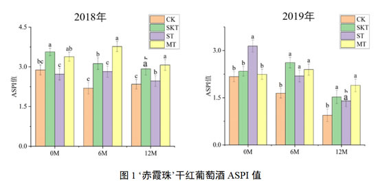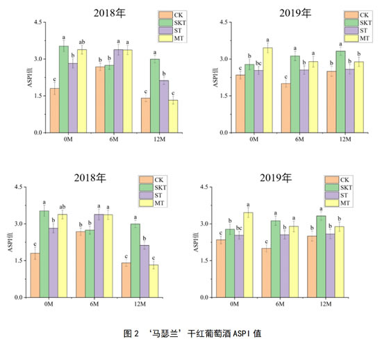 图2展示了两个年份‘马瑟兰’葡萄酒在桶储陈酿过程中的涩感强度变化,由图可知,2018年‘马瑟兰’葡萄酒在添加了不同来源的葡萄单宁后,各处理组的涩感强度在不同的陈酿时间表现出了一定的差异:在陈酿6个月时,籽单宁处理组和皮籽混合单宁处理组的涩感强度显著高于皮单宁处理组,而在陈酿12个月后,葡萄皮单宁对‘马瑟兰’葡萄酒涩感强度的作用更大,其ASPI结果显著高于其他处理组。葡萄籽单宁的添加,有助于陈酿过程中酒样涩感强度的提升与稳定,但这种效果更多的体现在陈酿中期,随着陈酿时间的进行,葡萄皮单宁的作用更佳。