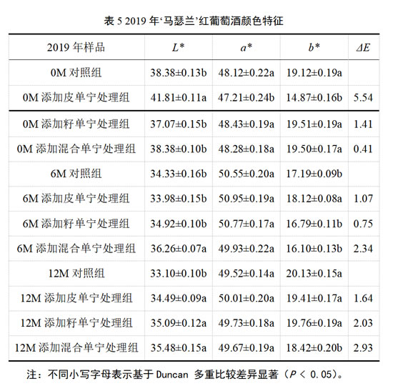 而对于2019年‘马瑟兰’葡萄酒(表5),在陈酿6个月时,皮籽混合单宁处理组的L*值最高,且显著高于对照组与其他处理组,同时其b*值最低,表明酒样具有最浅的颜色和最低的黄色色调。并且当陈酿时间达到12个月时,皮籽混合单宁处理组仍保持了最低的b*值,显著减弱了酒样的黄化程度。同18年‘马瑟兰’葡萄酒添加实验类似的是,在整个陈酿过程中,对照组同各处理组之间也均不存在肉眼可以辨识的颜色差异,其ΔE值均低于3。这一现象与以往研究存在一定差异,可能原因是‘马瑟兰’是一种富含花色苷类物质的酿酒葡萄品种,其所酿造的葡萄酒产品颜色表现较好,因此添加单宁等辅料后,对酒体本身的影响是有限的。除此之外,也可能是陈酿时间较短,难以明确添加不同来源葡萄单宁对‘马瑟兰’葡萄酒颜色稳定性的影响。