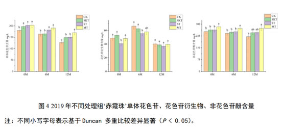 类似地对2019年‘赤霞珠’葡萄酒中单体花色苷、花色苷衍生物和非花色苷酚含量进行了分析:在刚入桶时,葡萄单宁的添加能够显著提升葡萄酒中的单体花色苷含量,这与2018年结果并不一致;葡萄籽单宁的加入显著降低了花色苷衍生物的含量;葡萄皮籽混合单宁的加入能够显著增加酒中非花色苷酚的含量。在经过12个月的陈酿后,添加了葡萄单宁的各处理组,其对单体花色苷和非花色苷酚的保护效果均好于对照组,其中添加了葡萄皮籽混合单宁的处理组对这些酚类物质的保护最为有效。但对于花色苷衍生物来说,添加不同来源的葡萄单宁在桶储陈酿12个月后不会影响其积累。