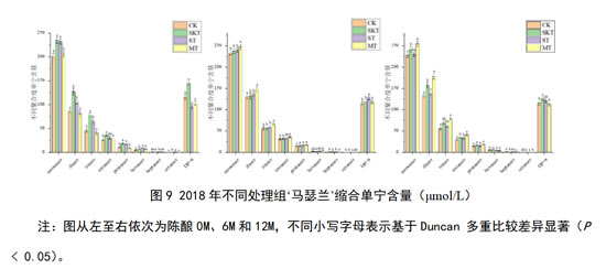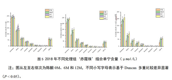 总的来说,对于2018年‘赤霞珠’葡萄酒中的黄烷醇单体的含量随陈酿进行而逐渐降低;对于酒中的低聚单宁,其含量主要呈现随陈酿时间逐渐降低的趋势,这可能是酒中高聚单宁逐渐分解,或是单体、二聚体不断聚合导致的,酒中的高聚单宁随陈酿时间增加而逐渐升高,但籽单宁处理组呈现随陈酿时间增加先降低后增加的趋势。