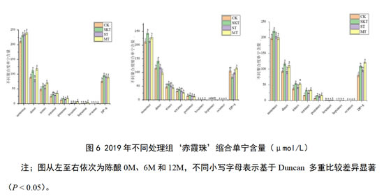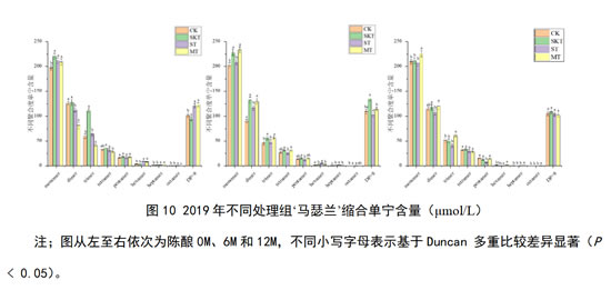 由图10,对于2019年‘马瑟兰’葡萄酒,对其对照组及不同处理组的缩合单宁含量进行分析:在刚入桶时,添加葡萄皮单宁可显著提高酒中大部分不同聚合度单宁含量,对于酒样中聚合度大于8的单宁来说,主要是葡萄籽单宁的作用使其含量提高。在经过12个月的陈酿后,能够提高酒样中各聚合度单宁含量的处理组是皮单宁和皮籽混合单宁的处理组,其中,皮籽混合单宁处理组效果更为显著。这一现象在陈酿6个月是,就有所体现,在陈酿6个月时,葡萄皮单宁的添加对于单宁含量的提升效果优于陈酿12个月。