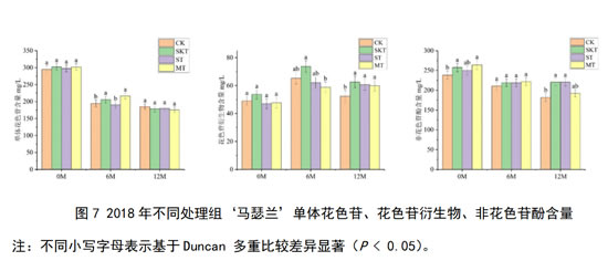 对2018年‘马瑟兰’葡萄酒中单体花色苷、花色苷衍生物和非花色苷酚含量进行了分析(图7):在刚入桶时,对照组和添加不同来源葡萄单宁的处理组之间的单体花色苷和花色苷衍生物含量无显著差异;皮单宁处理组和皮籽混合单宁处理组显著增加了总非花色苷酚的含量。在陈酿12个月后,添加葡萄皮单宁或添加葡萄籽单宁进行陈酿均能使得花色苷衍生物和非花色苷酚的含量显著高于对照组,由上述现象可知,添加不同来源的葡萄单宁进行陈酿,其对于葡萄酒中的单体花色苷含量影响较小;添加单宁进行陈酿能够促进花色苷衍生物的形成,并减缓其降解,同时也能维持葡萄酒中非花色苷酚含量的稳定。