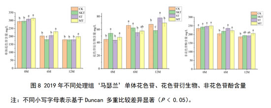 对于2019年‘马瑟兰’葡萄酒而言,其单体花色苷、花色苷衍生物和非花色苷酚含量如图8所示,在刚入桶时,葡萄籽单宁和皮籽混合单宁的添加能够显著提升葡萄酒中的单体花色苷的含量;葡萄皮单宁和皮籽混合单宁显著增加了酒中花色苷衍生物的含量。在经过12个月的陈酿后,添加了葡萄单宁的各处理组,其对单体花色苷和非花色苷酚的保护效果均好于对照组,其中添加了葡萄皮籽混合单宁的处理组对花色苷衍生物的保护最为有效。对于花色苷衍生物来说,添加不同来源的葡萄单宁在桶储陈酿12个月后均能显著增加其含量,促进花色苷衍生物积累。