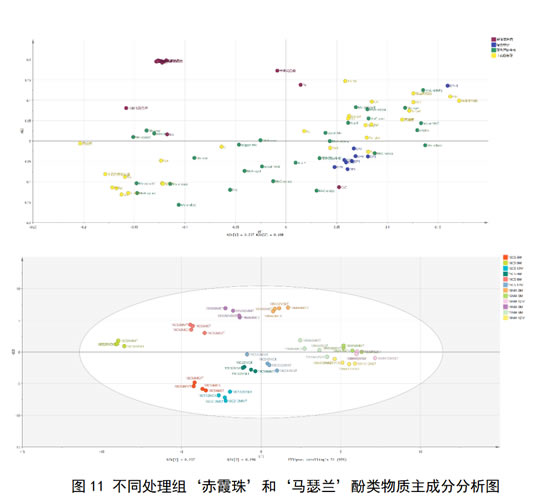 单宁的添加对于不同品种,不同年份、不同陈酿时间的葡萄酒,对其酚类物质演变和对于葡萄酒颜色和涩感的影响不尽相同,可能是由于不同葡萄酒本身不同的基质组成所带来的影响,故对于两个年份不同陈酿时间不同处理组的‘赤霞珠’和‘马瑟兰’葡萄酒的酚类物质进行主成分分析,由图11可知,首先,两个品种葡萄酒得到明显的区分,‘马瑟兰’葡萄酒主要分布在第一、四象限,和‘赤霞珠’葡萄酒得以明显区分。此外,对于两个品种葡萄酒进行单独分析,2018年刚入桶‘赤霞珠’酒样桶19年刚入桶酒样得以明显区分,表明两个年份赤霞珠酒样酚类物质轮廓有较大差异。18年刚入桶‘赤霞珠’酒样对应黄烷醇,表明其黄烷醇含量高,其距离高聚单宁较远,高聚单宁含量少,单宁加入后,能够有效维持单宁的含量,有效增强葡萄酒涩感,其花色苷衍生物含量少,单宁加入后有效促进花色苷衍生物生呈,使颜色有明显差异。2019年酒样对应花色苷衍生物,其高聚单宁含量多,富含花色苷衍生物,单宁加入后,对酒样本身单宁维持效果一般,对花色苷影响小,故酒样间未产生明显颜色差异。
