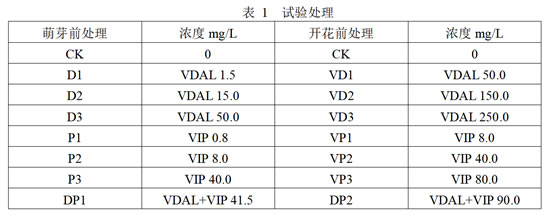 从表2可看出,与对照组相比,P1、P2、D3、DP1处理新梢节间长度均显著大于对照组,其中P2处理,VIP 浓度8.0 mg/L下新梢节间长度最长,为6.36 cm,其次为P1处理,VIP浓度0.8 mg/L下节间长度为6.19 cm,P1、P2处理新梢节间长度相较于对照分别高出30.86%及27.37%。较高浓度的DP1及D3处理,即VDAL+VIP 41.5 mg/L及VDAL50.0 mg/L处理下新梢节间长度相较于对照分别高出15.23%及12.55%。表明较低浓度的VIP 及较高浓度VDAL+VIP混合物及VDAL均有助于植株的枝条伸长生长,在新梢生长期表现出一定的优势。
