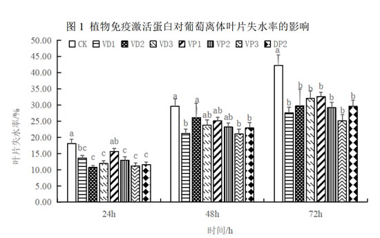 2.3 植物免疫激活蛋白对葡萄离体叶片失水率的影响