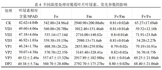 在植物组织中,可溶性蛋白质含量的变化反映了植物的生长状态、代谢活性及对外界环境的响应。由表5可知,不同处理叶片中可溶性蛋白质的含量均显著高于对照组,尤其以VD2、VP1处理效果最好,叶片内可溶性蛋白含量分别是14.21 mg·g-1及13.96 mg·g-1,分别比对照增加11.10%及9.15%,有利于满足葡萄生长发育过程中对营养物质的需求,为增加葡萄产量提供基础。