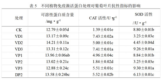 2.5 植物免疫激活蛋白对葡萄叶片抗性指标的影响