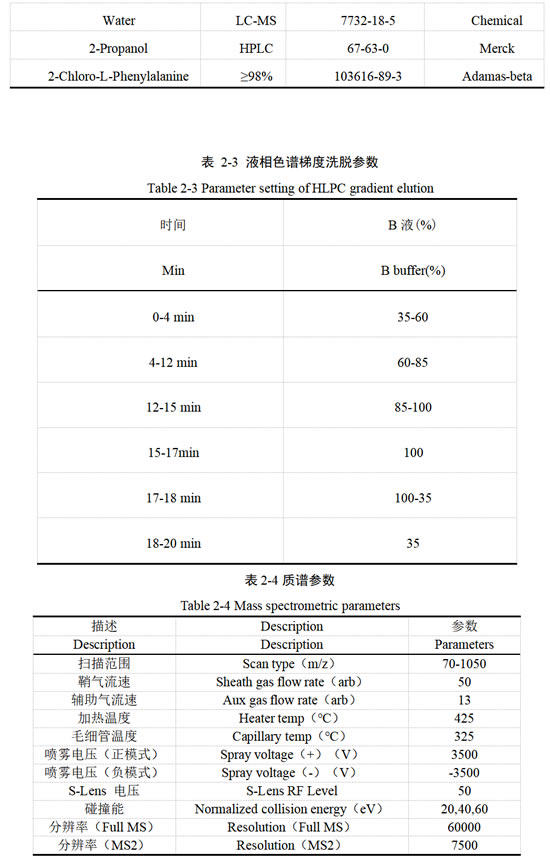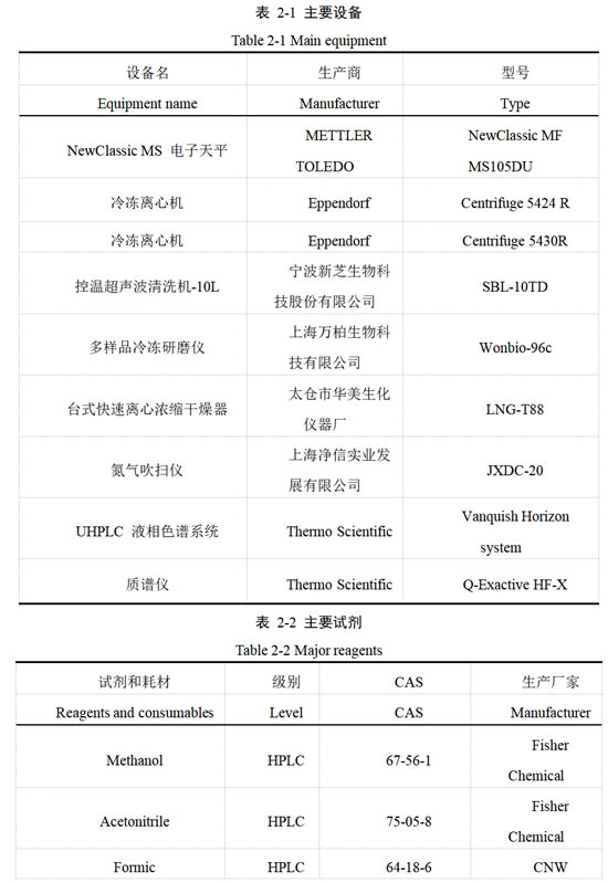 代谢组样本与上述转录组相同,分为12 组,每组有6 个生物学重复,共计72个样品进行代谢组样本制备,上述过程由上海美吉生物有限公司完成。具体设备、试剂及参数如下表所示: