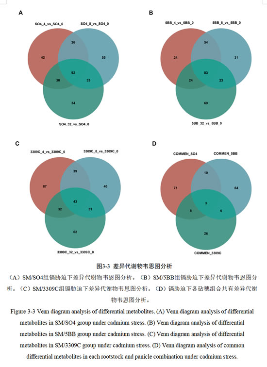 利用韦恩图分析葡萄三种砧穗组合、不同镉浓度胁迫的差异代谢物情况(图3-3),结果表明,SM/SO4组共有的差异代谢物数量为92;SM/5BB共有的差异代谢物数量为83;SM/3309C共有的差异代谢物数量为43。同时对不同砧穗组合的共有差异代谢物进行韦恩图分析,发现SM/SO4组特有的差异代谢物有71个,SM/5BB组特有的差异代谢物有64个,SM/3309C组特有的差异代谢物有26个。