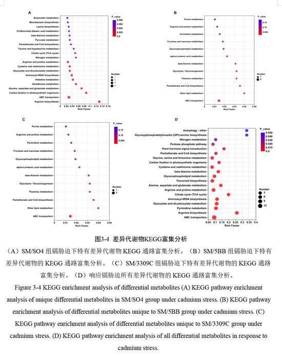 综上所述,SM/SO4组大量差异代谢物显著富集在氨基酸代谢,ABC转运蛋白,碳水化合物代谢等通路;SM/5BB组差异代谢物显著富集ABC转运蛋白,乙醚脂质代谢通路;SM/3309C组差异代谢物显著富集在磷酸戊糖途径,甘油磷脂代谢,自噬-其他通路,同时响应镉胁迫的所有差异代谢物显著富集在氨基酸代谢,碳水化合物代谢,ABC转运蛋白,核苷酸代谢,脂类代谢,其他次级代谢物的生物合成等通路。可以发现在代谢水平上,SM/SO4和SM/5BB对镉胁迫的响应更为相似,都显著富集在ABC转运蛋白。