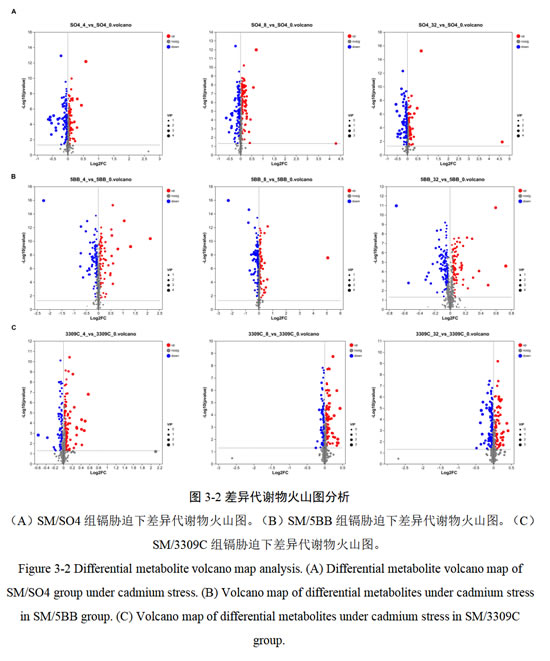与对照相比,SM/3309C组在0.4mg/kg的镉胁迫下共检测到201种显著差异代谢物,133 种代谢物上调,如4-硫酸多巴胺(1.41倍),68种代谢物下调,如牡丹素 3-(6''-对香豆基葡糖苷)(0.67倍);在0.8mg/kg的镉胁迫下共检测到159种显著差异代谢物,98 种代谢物上调,如佩塔辛甙(1.30倍),61种代谢物下调,如6'-硫酸软骨素(Chondroitin 6'-sulfate、0.87倍),在3.2mg/kg的镉胁迫下共检测到168种显著差异代谢物,71种代谢物上调,如苯乙酸乙酯(1.21倍),97种代谢物下调,如4-(2-硝基乙基)苯基芋甲苷(4-(2-Nitroethyl)phenyl primeveroside、0.72倍)(图3-2C)。