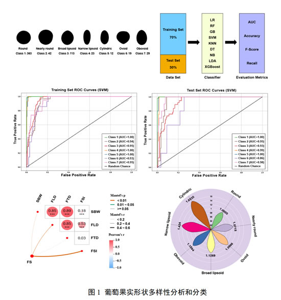 本研究对来自国家葡萄种质资源库的601个葡萄品种进行了果实形状多样性分析,根据形态特征,将果实形状划分为圆形、近圆形、宽椭圆形、窄椭圆形、圆柱形、卵形和倒卵形共7个类别。为精准解析果实形状变异规律,我们建立了机器学习分析流程。将果实形状数据按7:3比例划分为训练集和测试集,系统评估了9种常用分类器的性能。综合比较各分类器在测试集上的AUC、准确率等指标后,选择支持向量机作为最优分类器。SVM在大多数果实形状类别中表现出色,特别是对圆形和圆柱形的识别达到了完美区分。分析发现果实形状与形状指数存在强相关性。通过将七类形状按平均形状指数升序排列并可视化,清晰展示了各类别的形状指数分布范围,为葡萄果实形状鉴定提供了可靠依据。