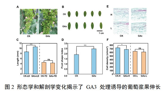 如图 2A 所示,GA3 处理 14 天后,葡萄浆果相较于对照组有所伸长。施加 GA3 后,葡萄浆果的纵径相较于对照组显著增加,而横径没有显著差异(图 2B、C)。此外,果实形状指数也显著增加(图 2D)。这些结果表明,GA3 处理促进了葡萄浆果的纵向生长。为了观察葡萄浆果的解剖学生长情况,在处理 14 天后,采用石蜡切片法制备了葡萄浆果细胞的横截面(图 2E)。与对照组相比,GA3 处理导致水平和横向方向的细胞密度(单位面积的细胞数量)均降低(图 2F)。