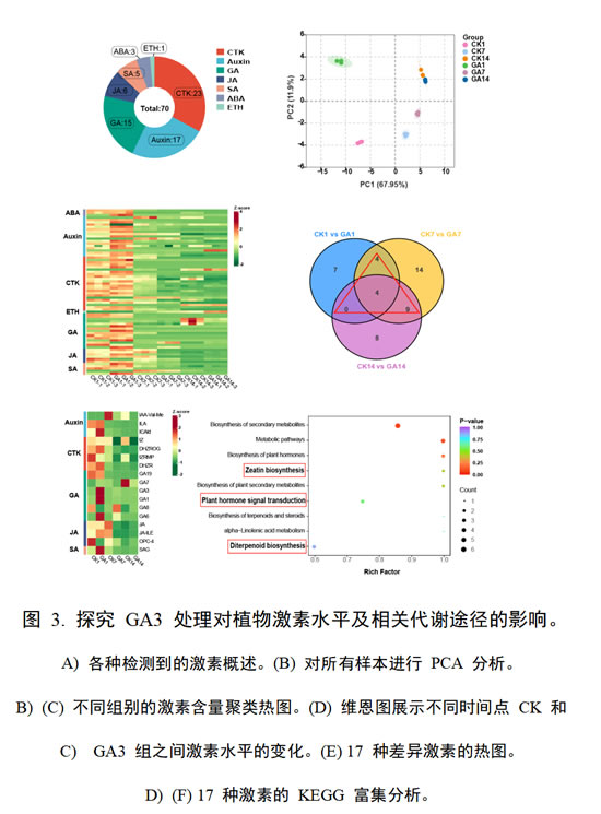 本研究对70种植物激素及相关物质进行了分析,涵盖细胞分裂素(23种)、生长素(17种)、赤霉素(15种)等主要类别。主成分分析显示,处理组与对照组间差异显著,且随果实发育逐渐减小。聚类热图表明,多数激素在处理后第1天含量最高,随后普遍下降。维恩图显示多个时间点共有的差异激素。具体而言,GA3处理显著提升了内源性GA1、GA3、GA6以及ICAld、JA-ILE等激素水平,同时降低了tZ、GA8等含量。KEGG富集分析发现这些差异激素显著富集于植物激素信号转导、玉米素生物合成和二萜生物合成等途径,与实验观察到的激素变化模式相一致。