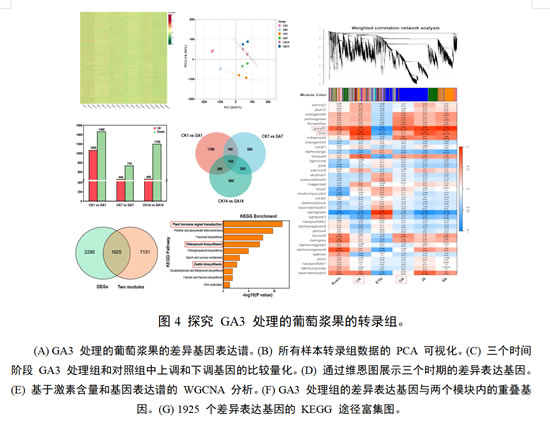 本研究对赤霉素处理的葡萄浆果与对照组在三个时间点进行了RNA-seq分析,共构建18个cDNA文库。PCA与差异表达热图显示生物学重复间一致性高,且组间差异显著,体现了数据的可靠性。差异基因数量在初期处理中最多,且各时期下调基因均多于上调基因。三个时期共鉴定到4215个差异表达基因(DEGs),其中981个基因在至少两个时间点差异表达。通过WGCNA分析,筛选出与赤霉素和细胞分裂素正相关的grey60和blue模块。进一步与4215个DEGs取交集,获得1925个共有基因。KEGG富集分析表明这些基因显著富集于植物激素信号转导、类黄酮生物合成、苯丙烷生物合成、二萜生物合成、玉米素生物合成以及倍半萜和三萜生物合成等通路。其中,倍半萜和三萜生物合成、二萜生物合成以及玉米素生物合成途径与代谢组KEGG分析结果一致,揭示了激素处理在代谢调控层面的关键作用。