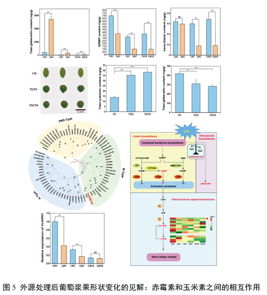 综合分析倍半萜和三萜、二萜及玉米素生物合成途径,发现这些代谢路径互有关联。GA₃处理一天后,内源赤霉素含量显著上升,而玉米素合成途径中的关键代谢物tZRMP则明显下降;其下游代谢物反式玉米素(tZ)在处理7天和14天后也显著降低。相反,使用TDZ处理后,浆果形态变圆,总细胞分裂素上升而赤霉素下降,提示赤霉素与玉米素合成比例在外源GA₃介入后失衡,进而影响果实形态。此外,葡萄基因组中共鉴定到30个拟南芥型响应调节因子(ARR)家族成员,包括5个A型、13个B型和12个PRR型成员。细胞分裂素信号通过双组分系统传导:B型ARR作为转录因子可激活A型ARR表达,后者又反馈抑制B型活性,形成调控回路。其中,与拟南芥ARR1同源的VvARR1在GA₃处理后第1天和第7天表达显著下调。作为细胞分裂素信号的正调控因子,VvARR1表达下降可能影响下游响应基因,最终导致果形变化。