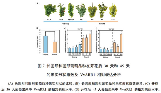 随后,我们鉴定了 7 个具有长圆形和圆形果实形状的葡萄品种,评估了开花后 30 天和 45 天的果实形状指数以及 VvARR1 的相对表达量(图 7A)。长圆形浆果的果实形状指数显著高于圆形浆果(图 7B)。此外,在开花后 30 天和 45 天,圆形浆果中 VvARR1 的相对表达量均显著高于长圆形浆果(图 7C、D)。