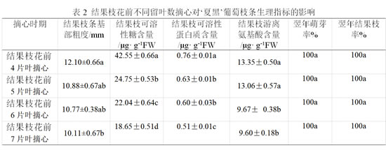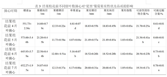 综上,本研究认为鲜食葡萄品种‘夏黑’结果枝采取花前果穗以上留5片功能叶摘心,对其树体生长及品质形成较好。