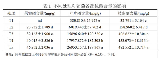 试验地位于河南郑州,土质为沙壤土。试验材料为8年生巨玫瑰葡萄,株行距为3 m×8 m,棚架,长势强旺。试验采用氨基酸有机硒肥,稀释后质量浓度分别为0 mg/L(T1)、10 mg/L(T2)、20 mg/L(T3)、30 mg/L(T4),40 mg/L(T5),在幼果期(花后10 d)和果实膨大期(花后25 d)各叶面喷施一次,共喷施2次。每个处理随机选择4株长势相似、健壮无病害植株。