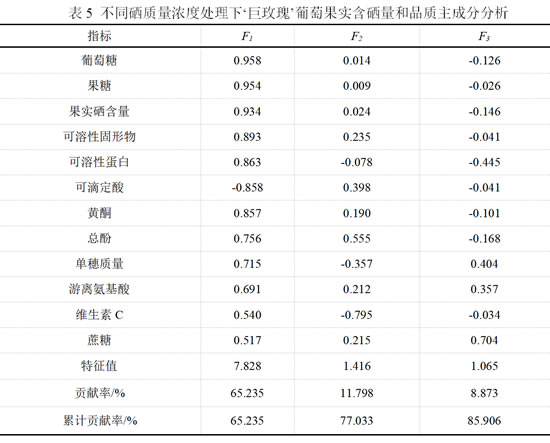 通过主成分分析,12项果实含硒量和品质指标得到3个主成分,累计贡献率达85.906 %(表5)。其中,第1主成分F1特征值的贡献率65.235%,主要包括葡萄糖、果糖、果实硒含量、可溶性固形物、可溶性蛋白、可滴定酸、黄酮、总酚、单穗质量、游离氨基酸硒,主要反映葡萄的产量、果实品质和抗氧化物质。第2主成分F2特征值的贡献率11.798%,包括维生素C,既是果实营养成分又是抗氧化物质。第3主成分F3特征值的贡献率8.873%,包括果实营养成分蔗糖。