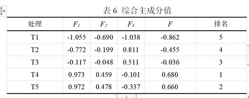 以3个主成分和其对应的方差贡献率C1的乘积为权重,构建主成分综合评价模型F=C1F1+C2F2+C3F3,分别计算3个主成分的综合得分F值,F值越高,则该处理效果越好。由表6可得到叶面喷施不同硒质量浓度处理下,‘巨玫瑰’葡萄果实含硒量和品质的综合评分,由高到低依次为T4、T5、T3、T2、T1,即硒质量浓度为30 mg/L综合评分最高,其次为40mg/L、20 mg/L和10 mg/L,4个硒处理的排名均高于未喷硒处理组。