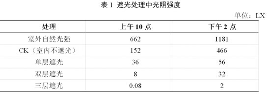 遮阳后光照强度测定:选择晴朗天气(10月20日),使用3051C光合仪器,于上午10点和下午2点分别测定不同遮阳网层数内的光照强度,以不遮阳为对照,单层、双层、三层及对照的光照强度见下表。