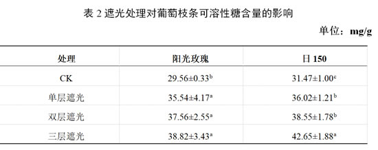 枝条只有完全成熟,才会表现出良好的抗寒性。糖类物质的积累能增加细胞的渗透压,起保护植株的作用,还能促进蛋白质的合成,有利于植株抗寒性的提高,从而增强植株的抗寒性,使植株安全越冬。本章以‘阳光玫瑰’和‘日150’为试材,通过葡萄生长后期遮光处理,分析不同技术措施对促进枝条养分物质积累的影响。