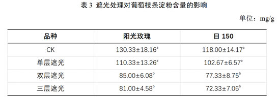 由表3可知,各处理下‘阳光玫瑰’和‘日150’枝条淀粉含量均低于对照。在‘阳光玫瑰’上,三层遮光处理下枝条淀粉含量较对照降低最多,为37.85%;其次为双层遮光处理,淀粉含量较对照降低34.78%;单层遮光处理较对照降低最少,为15.34%。在‘日150’上,三层遮光处理后淀粉含量较对照降低最多,为38.70%;其次为双层膜遮光处理,较对照降低34.46%;单层膜遮光处理后淀粉含量较对照降低最少,为12.99%,说明果实采收后,使用三层遮光处理可显著降低枝条淀粉含量。
