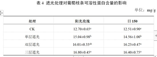 由表4可知,各处理下‘阳光玫瑰’和‘日150’枝条可溶性蛋白含量均高于对照。在‘阳光玫瑰’上,三层遮光处理下枝条可溶性蛋白含量较对照增加最多,为32.28%;其次为双层遮光处理,较对照增加26.06%;单层膜遮光处理较对照增加最少,为18.42%。在‘日150’上,三层遮光处理后枝条可溶性蛋白含量较对照增加最多,为31.09%;其次为双层遮光处理,可溶性蛋白含量较对照增加29.73%;单层遮光处理较对照增加最少,为16.38%。说明果实采收后,使用三层遮光处理可显著提高枝条可溶性蛋白含量。