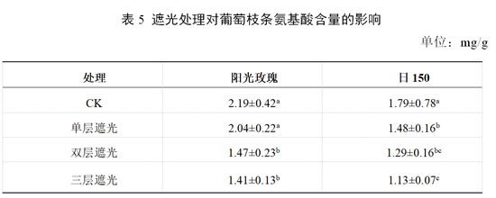 由表5可知,各处理下‘阳光玫瑰’和‘日150’枝条氨基酸含量均低于对照。在‘阳光玫瑰’上,三层遮光处理下氨基酸含量较对照降低最多,为35.61%;其次为双层遮光处理,氨基酸含量较对照降低32.87%;单层遮光处理较对照降低最少,为6.84%。在‘日150’上,三层遮光处理下氨基酸含量较对照降低最多,为36.87%;其次为双层遮光处理,氨基酸含量较对照降低27.93%;单层膜遮光处理较对照较低17.31%。说明果实采收后,使用三层遮光处理可显著降低枝条氨基酸含量。