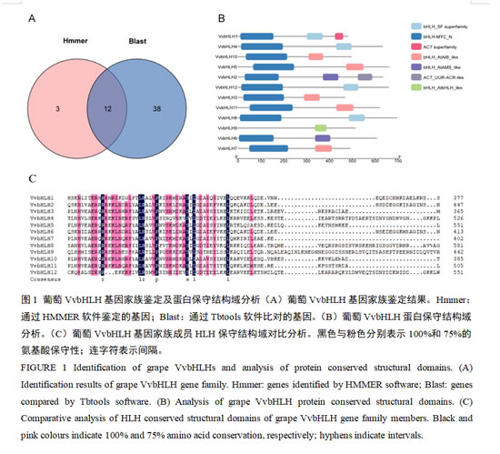 通过HMMER软件和TBtools本地BLAST分析,我们鉴定出12个符合筛选标准的葡萄bHLH蛋白序列(图1A)。根据染色体定位,将这些bHLH序列命名为VvbHLH1~VvbHLH12。基于保守结构域分析,将葡萄bHLH家族分为bHLH_SF超家族、bHLH-MYC_N、ACT超家族、bHLH_AtAIB_like、bHLH_AtAMS_like、ACT_UUR-ACR-like和bHLH_AtbHLH_like共7种类型。除VvbHLH9外,其余11个VvbHLH蛋白的N端均含有bHLH-MYC_N结构域(图1B)。通过DNAMAN软件对12个葡萄bHLH的HLH保守结构域分析表明,C端HLH结构域富含疏水性氨基酸亮氨酸(L)和脯氨酸(P),其中L高度保守,对维持bHLH蛋白二级结构的稳定性具有重要作用(图1C)。