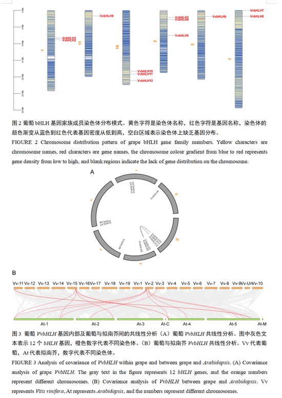 为探究VvbHLH的进化复制事件,我们分析了其染色体分布与共线性关系。根据葡萄基因组注释gff3文件,鉴定出的12个葡萄VvbHLH基因定位于6条染色体上(图2)。这些基因呈不规则分布,在不同染色体骨架上的分布密度各异:其中2号和15号染色体包含的bHLH基因数量最多(各3个),1号和7号染色体各含2个bHLH基因,3号和11号染色体所含bHLH基因数量最少(各1个)。