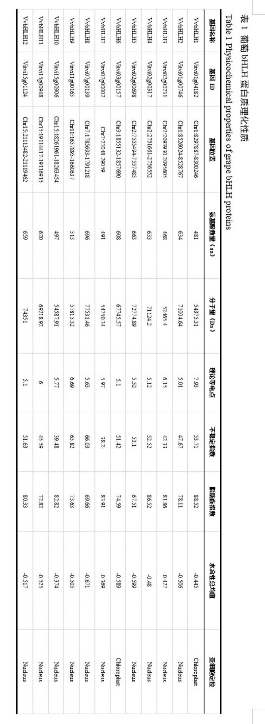 葡萄bHLH蛋白理化性质分析表明(表1):其氨基酸长度在468 aa(VvbHLH3)至696 aa(VvbHLH8)之间。12个bHLH蛋白的分子量范围是52,465.4 Da至77,531.46 Da,其中VvbHLH8分子量最大,VvbHLH3最小。等电点(pI)介于5.01(VvbHLH2)到7.93(VvbHLH1)之间,其中11个bHLH蛋白的pI值处于5-7之间,表明大多数葡萄bHLH家族蛋白理论上是酸性蛋白。不稳定系数范围在38.2(VvbHLH7)至66.03(VvbHLH8)之间,表明大多数成员为不稳定蛋白(不稳定指数II > 40);仅有两个属于稳定蛋白(II < 40),分别为不稳定系数38.2的VvbHLH7和39.48的VvbHLH10。脂肪系数介于67.51(VvbHLH5)到88.52(VvbHLH1)之间。此外,所有bHLH蛋白的GRAVY亲水性指数均小于0,表明这些蛋白主要呈现亲水性特征,但不同蛋白间的亲水性存在差异。亚细胞定位预测显示,大多数bHLH蛋白定位于细胞核,少数定位于叶绿体。