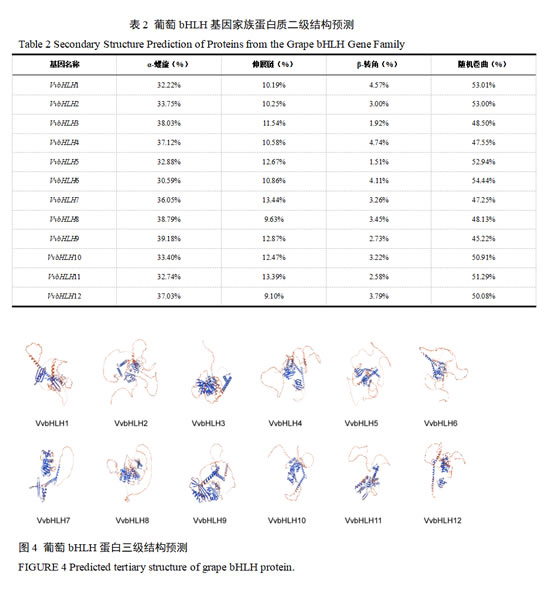 通过SOPMA对bHLH氨基酸序列进行二级结构预测分析发现,葡萄bHLH二级结构主要由α-螺旋(Hh)、无规卷曲(Cc)、β-转角(Tt)和延伸链(Ee)组成(表2)。其中无规卷曲和α-螺旋占比最大,β-转角占比最小。α-螺旋数量占比为30.59%(VvbHLH6)至39.18%(VvbHLH9),延伸链结构数量占比为9.10%(VvbHLH12)至13.44%(VvbHLH7),β-转角结构数量占比为1.51%(VvbHLH5)至4.74%(VvbHLH4),无规卷曲结构数量占比为45.22%(VvbHLH9)至54.44%(VvbHLH6)。通过SWISS-MODEL在线平台对葡萄bHLH序列进行三级结构预测分析显示,所有成员的模型匹配相似度均超过30%,且同一亚家族的蛋白结构具有高度相似性,但个体间也存在差异(图4)。
