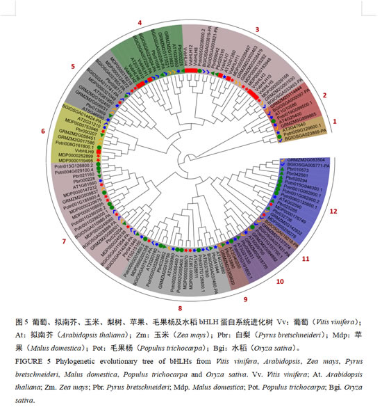 为了阐明葡萄与其他植物bHLH家族的系统发育关系,我们将葡萄bHLH基因家族蛋白序列与拟南芥、玉米、梨树、苹果、毛果杨和水稻的bHLH蛋白序列构建进化树(图5)。根据进化关系,不同物种的132个bHLH蛋白一共被分为12个亚族(Group 1-Group 12),其中最少的Group 11亚族只含有1个成员,最大的亚家族Group 3和Group7有22个成员。葡萄bHLHs的系统发育分析显示,12个VvbHLH蛋白序列可分为3组:Group 3组包含8个VvbHLH蛋白,Group 4组包含3个VvbHLH蛋白,Group 6组包含1个VvbHLH蛋白。从图中可以看出,所有的葡萄VvbHLH基因与梨树、苹果和拟南芥的总是聚在一起,亲缘关系较近,而与单子叶植物玉米和水稻亲缘关系相对较远。